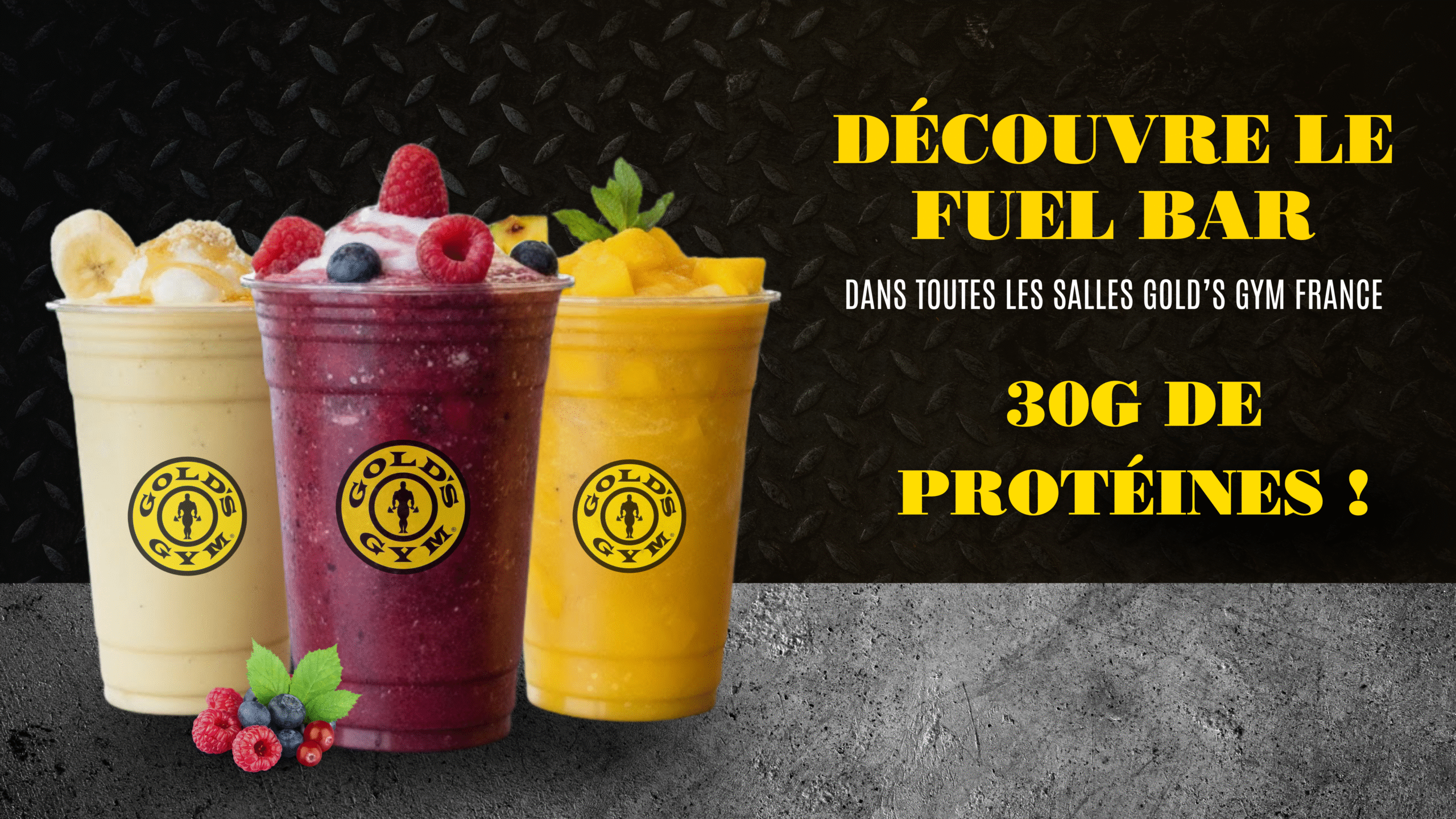 « Bienvenue au Fuel Bar Gold’s Gym, ta destination pour des smoothies performants ! Nos recettes sont conçues pour optimiser ta récupération et tes performances avec goût.